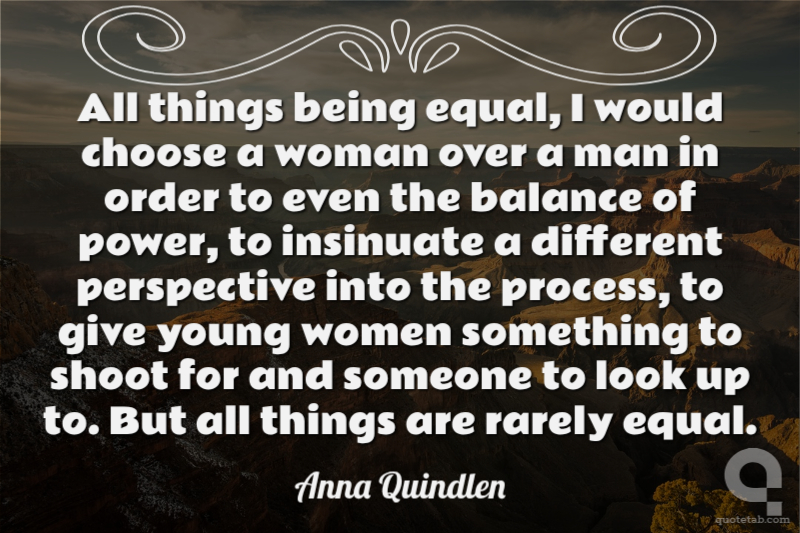 All things being equal, I would choose a woman over a man in order to even the balance of power, to insinuate a different perspective into the process, to give young women something to shoot for and someone to look up to. But all things are rarely equal.