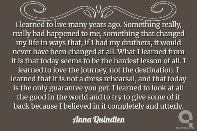 I learned to live many years ago. Something really, really bad happened to me, something that changed my life in ways that, if I had my druthers, it would never have been changed at all. What I learned from it is that today seems to be the hardest lesson of all. I learned to love the journey, not the destination. I learned that it is not a dress rehearsal, and that today is the only guarantee you get. I learned to look at all the good in the world and to try to give some of it back because I believed in it completely and utterly.