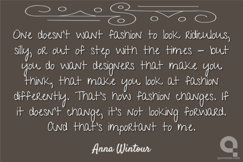 One doesn't want fashion to look ridiculous, silly, or out of step with the times - but you do want designers that make you think, that make you look at fashion differently. That's how fashion changes. If it doesn't change, it's not looking forward. And that's important to me.