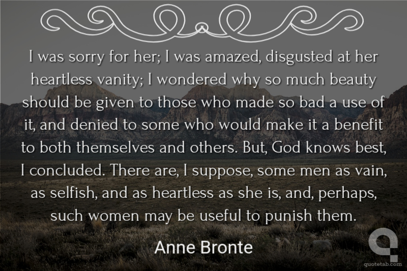 I was sorry for her; I was amazed, disgusted at her heartless vanity; I wondered why so much beauty should be given to those who made so bad a use of it, and denied to some who would make it a benefit to both themselves and others. But, God knows best, I concluded. There are, I suppose, some men as vain, as selfish, and as heartless as she is, and, perhaps, such women may be useful to punish them.