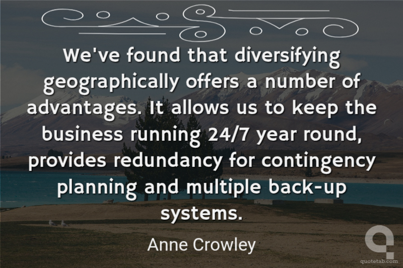 We've found that diversifying geographically offers a number of advantages. It allows us to keep the business running 24/7 year round, provides redundancy for contingency planning and multiple back-up systems.