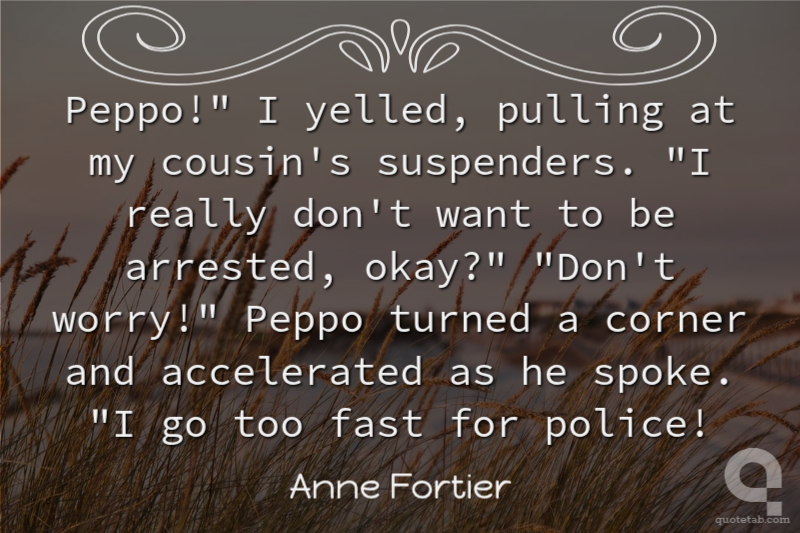 Peppo!" I yelled, pulling at my cousin's suspenders. "I really don't want to be arrested, okay?" "Don't worry!" Peppo turned a corner and accelerated as he spoke. "I go too fast for police!