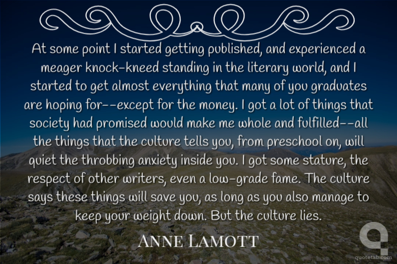 At some point I started getting published, and experienced a meager knock-kneed standing in the literary world, and I started to get almost everything that many of you graduates are hoping for--except for the money. I got a lot of things that society had promised would make me whole and fulfilled--all the things that the culture tells you, from preschool on, will quiet the throbbing anxiety inside you. I got some stature, the respect of other writers, even a low-grade fame. The culture says these things will save you, as long as you also manage to keep your weight down. But the culture lies.