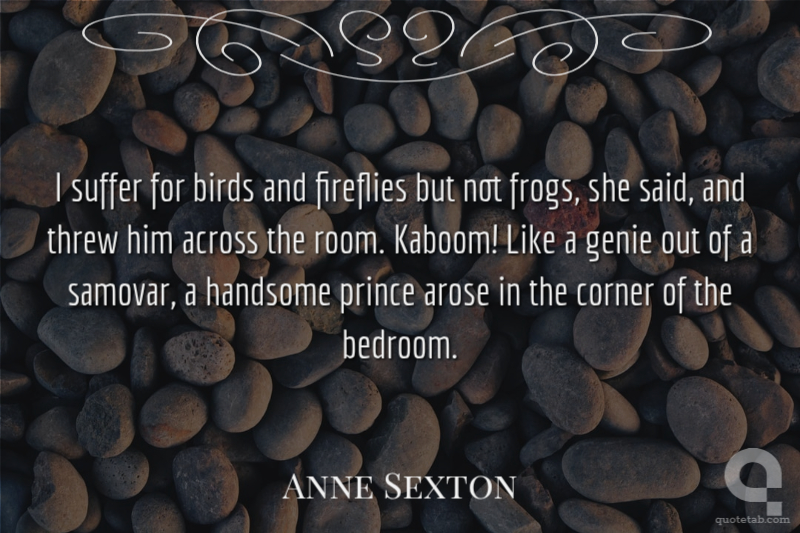 I suffer for birds and fireflies but not frogs, she said, and threw him across the room. Kaboom! Like a genie out of a samovar, a handsome prince arose in the corner of the bedroom.