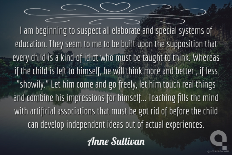 I am beginning to suspect all elaborate and special systems of education. They seem to me to be built upon the supposition that every child is a kind of idiot who must be taught to think. Whereas if the child is left to himself, he will think more and better , if less "showily." Let him come and go freely, let him touch real things and combine his impressions for himself... Teaching fills the mind with artificial associations that must be got rid of before the child can develop independent ideas out of actual experiences.