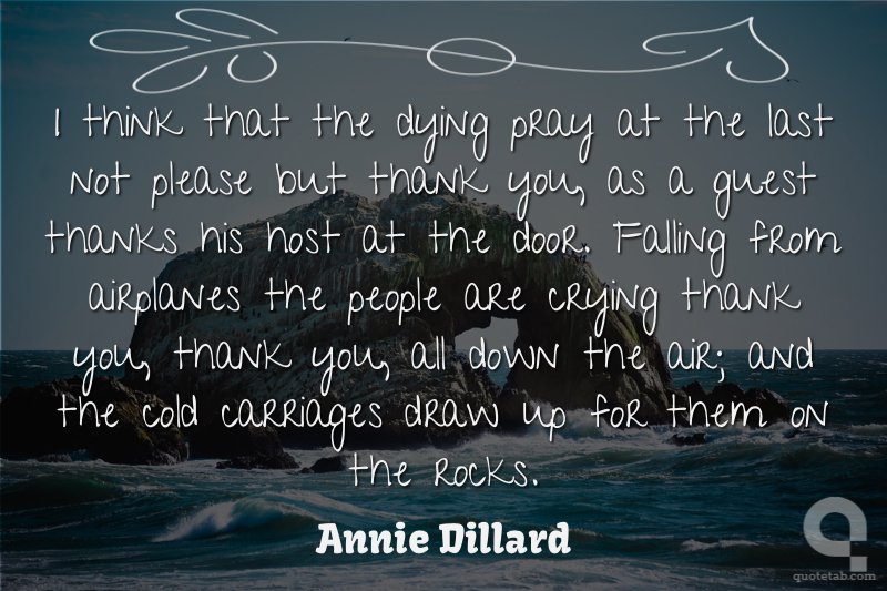 I think that the dying pray at the last not please but thank you, as a guest thanks his host at the door. Falling from airplanes the people are crying thank you, thank you, all down the air; and the cold carriages draw up for them on the rocks.