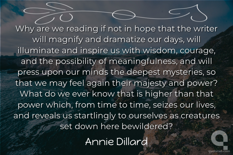 Why are we reading if not in hope that the writer will magnify and dramatize our days, will illuminate and inspire us with wisdom, courage, and the possibility of meaningfulness, and will press upon our minds the deepest mysteries, so that we may feel again their majesty and power? What do we ever know that is higher than that power which, from time to time, seizes our lives, and reveals us startlingly to ourselves as creatures set down here bewildered?