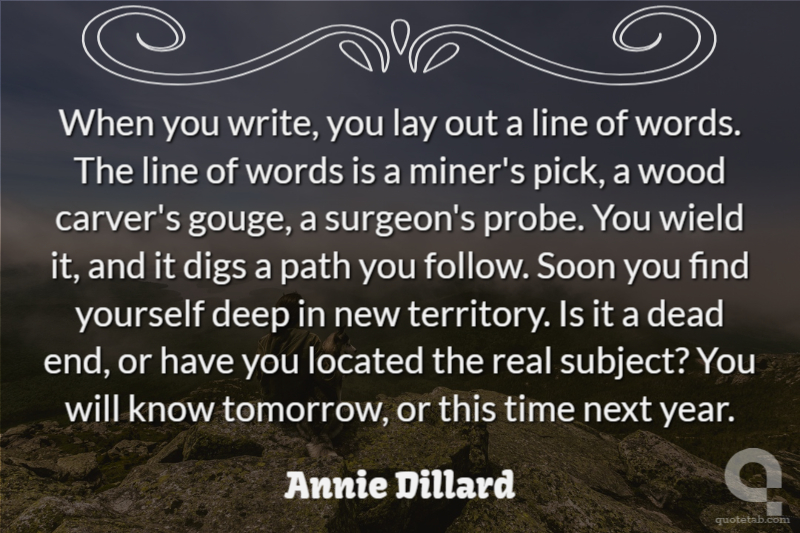 When you write, you lay out a line of words. The line of words is a miner's pick, a wood carver's gouge, a surgeon's probe. You wield it, and it digs a path you follow. Soon you find yourself deep in new territory. Is it a dead end, or have you located the real subject? You will know tomorrow, or this time next year.