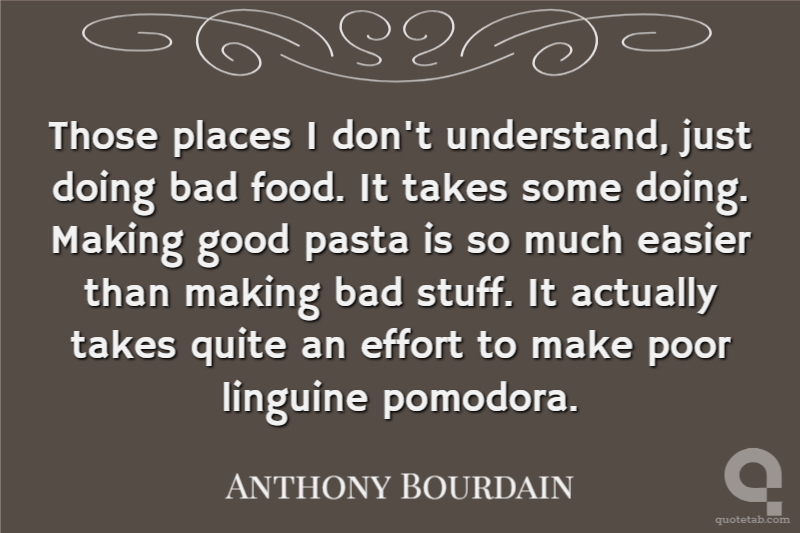 Those places I don't understand, just doing bad food. It takes some doing. Making good pasta is so much easier than making bad stuff. It actually takes quite an effort to make poor linguine pomodora.