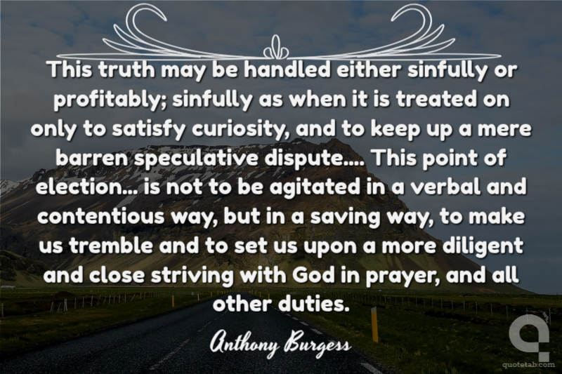 This truth may be handled either sinfully or profitably; sinfully as when it is treated on only to satisfy curiosity, and to keep up a mere barren speculative dispute.... This point of election... is not to be agitated in a verbal and contentious way, but in a saving way, to make us tremble and to set us upon a more diligent and close striving with God in prayer, and all other duties.