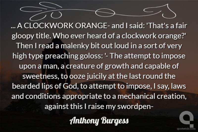 ... A CLOCKWORK ORANGE- and I said: 'That's a fair gloopy title. Who ever heard of a clockwork orange?' Then I read a malenky bit out loud in a sort of very high type preaching goloss: '- The attempt to impose upon a man, a creature of growth and capable of sweetness, to ooze juicily at the last round the bearded lips of God, to attempt to impose, I say, laws and conditions appropriate to a mechanical creation, against this I raise my swordpen-