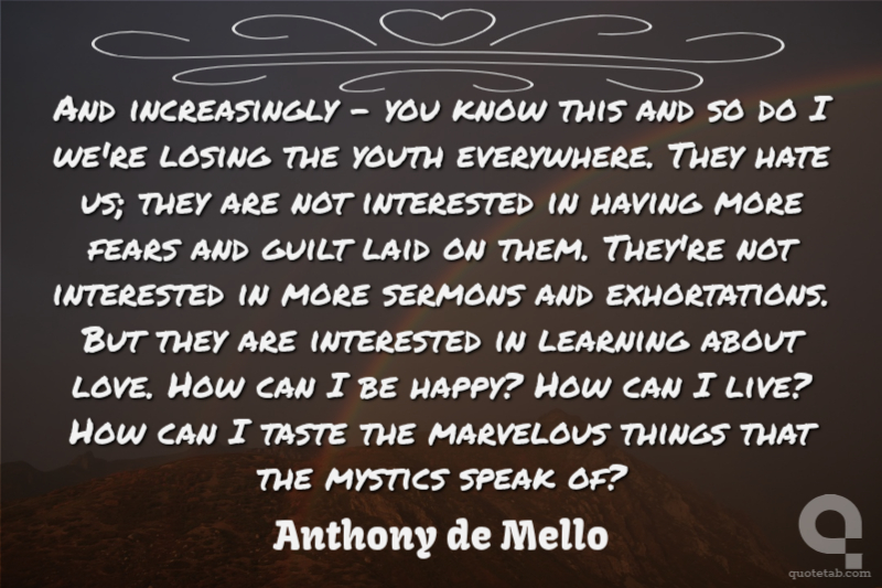 And increasingly - you know this and so do I we're losing the youth everywhere. They hate us; they are not interested in having more fears and guilt laid on them. They're not interested in more sermons and exhortations. But they are interested in learning about love. How can I be happy? How can I live? How can I taste the marvelous things that the mystics speak of?
