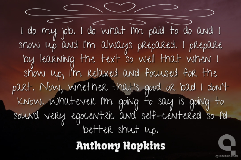 I do my job. I do what I'm paid to do and I show up and I'm always prepared. I prepare by learning the text so well that when I show up, I'm relaxed and focused for the part. Now, whether that's good or bad I don't know. Whatever I'm going to say is going to sound very egocentric and self-centered so I'd better shut up.