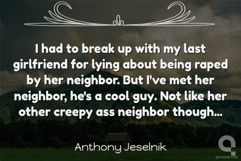 I had to break up with my last girlfriend for lying about being raped by her neighbor. But I've met her neighbor, he's a cool guy. Not like her other creepy ass neighbor though...