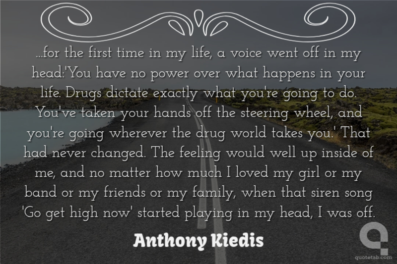 ...for the first time in my life, a voice went off in my head:'You have no power over what happens in your life. Drugs dictate exactly what you're going to do. You've taken your hands off the steering wheel, and you're going wherever the drug world takes you.' That had never changed. The feeling would well up inside of me, and no matter how much I loved my girl or my band or my friends or my family, when that siren song 'Go get high now' started playing in my head, I was off.