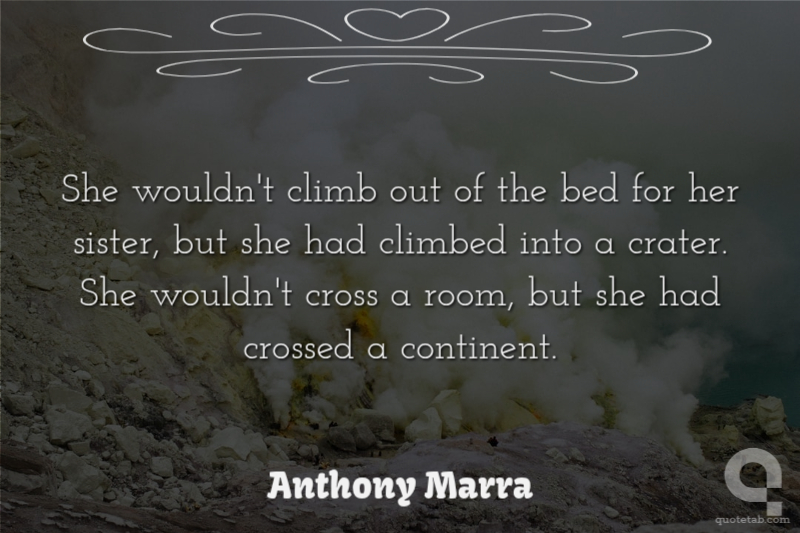 She wouldn't climb out of the bed for her sister, but she had climbed into a crater. She wouldn't cross a room, but she had crossed a continent.