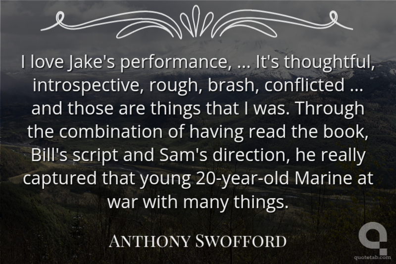 I love Jake's performance, ... It's thoughtful, introspective, rough, brash, conflicted ... and those are things that I was. Through the combination of having read the book, Bill's script and Sam's direction, he really captured that young 20-year-old Marine at war with many things.