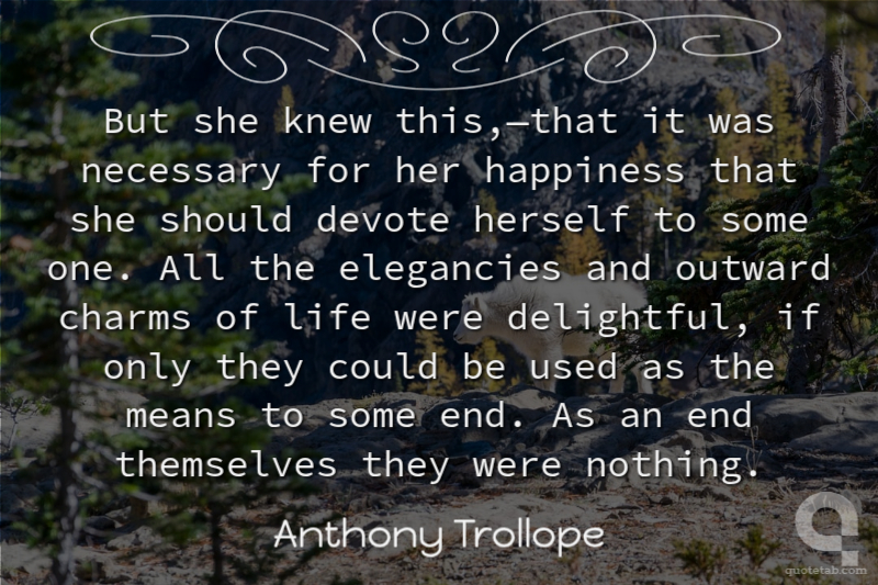 But she knew this,—that it was necessary for her happiness that she should devote herself to some one. All the elegancies and outward charms of life were delightful, if only they could be used as the means to some end. As an end themselves they were nothing.