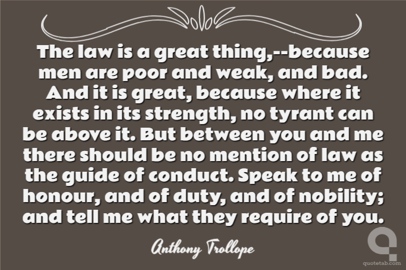 The law is a great thing,--because men are poor and weak, and bad. And it is great, because where it exists in its strength, no tyrant can be above it. But between you and me there should be no mention of law as the guide of conduct. Speak to me of honour, and of duty, and of nobility; and tell me what they require of you.