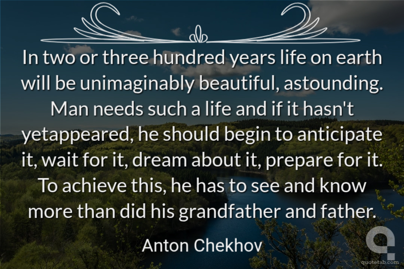 In two or three hundred years life on earth will be unimaginably beautiful, astounding. Man needs such a life and if it hasn't yetappeared, he should begin to anticipate it, wait for it, dream about it, prepare for it. To achieve this, he has to see and know more than did his grandfather and father.