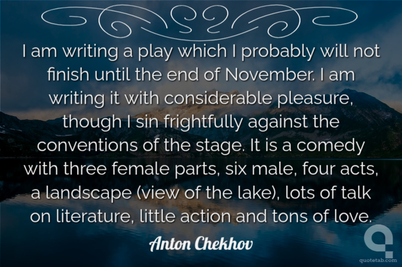 I am writing a play which I probably will not finish until the end of November. I am writing it with considerable pleasure, though I sin frightfully against the conventions of the stage. It is a comedy with three female parts, six male, four acts, a landscape (view of the lake), lots of talk on literature, little action and tons of love.