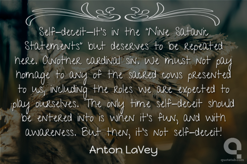 Self-deceit—It’s in the “Nine Satanic Statements” but deserves to be repeated here. Another cardinal sin. We must not pay homage to any of the sacred cows presented to us, including the roles we are expected to play ourselves. The only time self-deceit should be entered into is when it’s fun, and with awareness. But then, it’s not self-deceit!