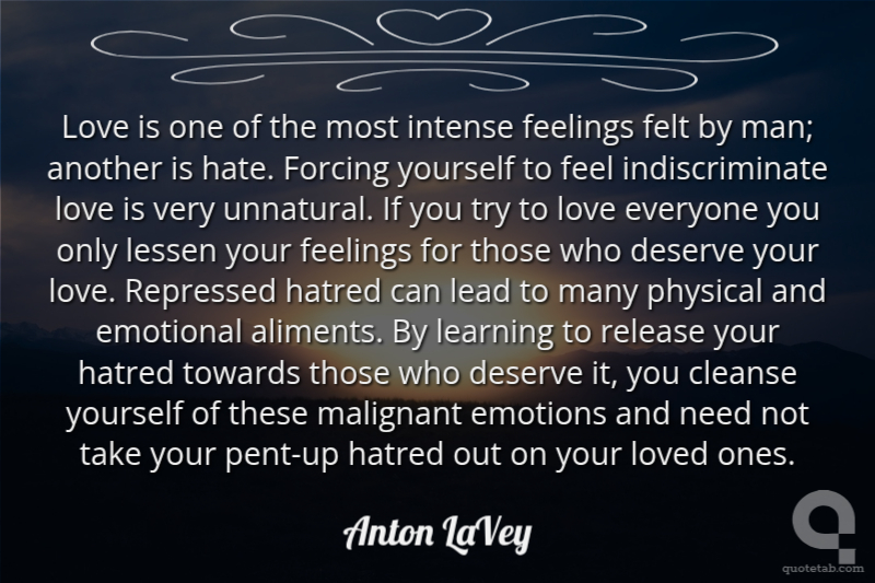 Love is one of the most intense feelings felt by man; another is hate. Forcing yourself to feel indiscriminate love is very unnatural. If you try to love everyone you only lessen your feelings for those who deserve your love. Repressed hatred can lead to many physical and emotional aliments. By learning to release your hatred towards those who deserve it, you cleanse yourself of these malignant emotions and need not take your pent-up hatred out on your loved ones.