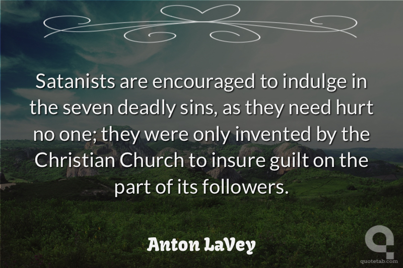 Satanists are encouraged to indulge in the seven deadly sins, as they need hurt no one; they were only invented by the Christian Church to insure guilt on the part of its followers.