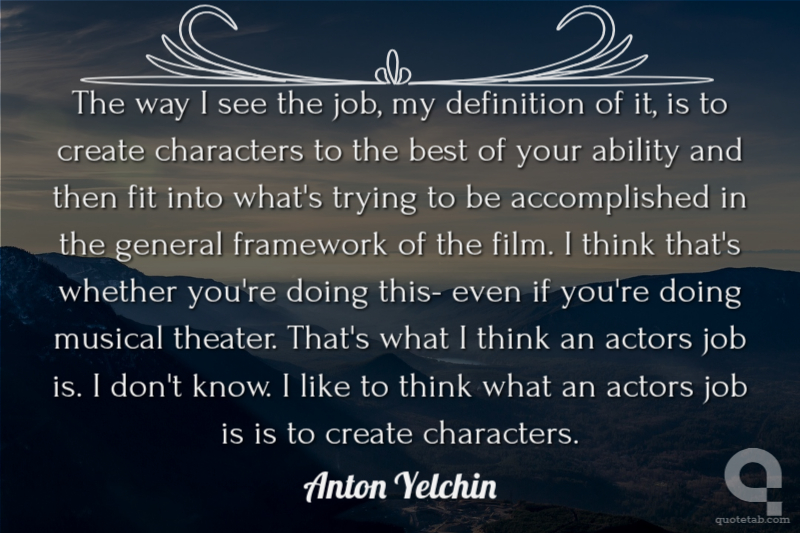 The way I see the job, my definition of it, is to create characters to the best of your ability and then fit into what's trying to be accomplished in the general framework of the film. I think that's whether you're doing this- even if you're doing musical theater. That's what I think an actors job is. I don't know. I like to think what an actors job is is to create characters.