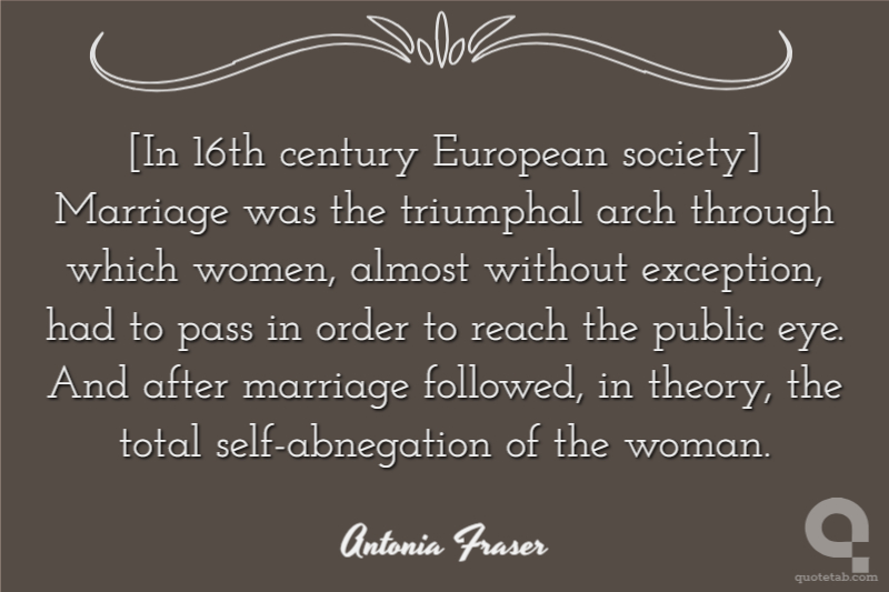 [In 16th century European society] Marriage was the triumphal arch through which women, almost without exception, had to pass in order to reach the public eye. And after marriage followed, in theory, the total self-abnegation of the woman.