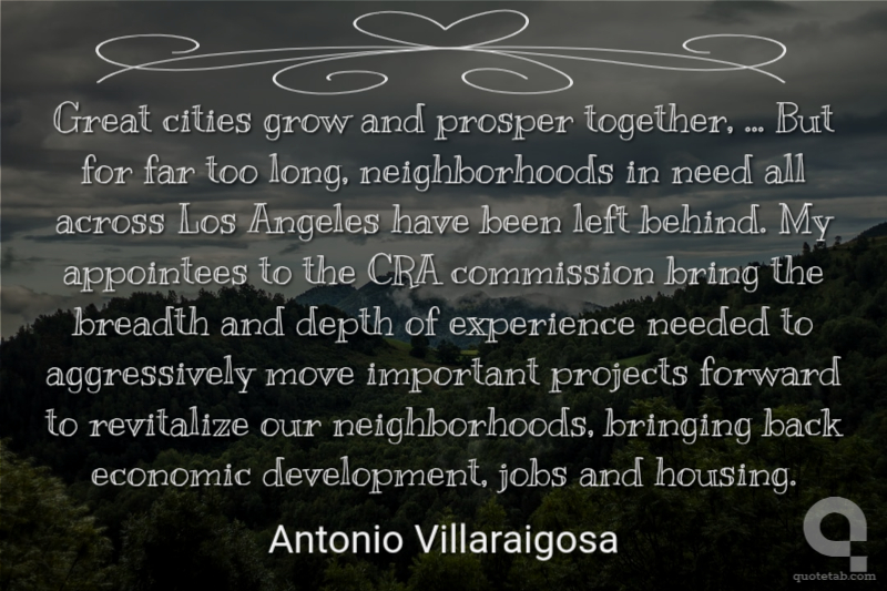 Great cities grow and prosper together, ... But for far too long, neighborhoods in need all across Los Angeles have been left behind. My appointees to the CRA commission bring the breadth and depth of experience needed to aggressively move important projects forward to revitalize our neighborhoods, bringing back economic development, jobs and housing.