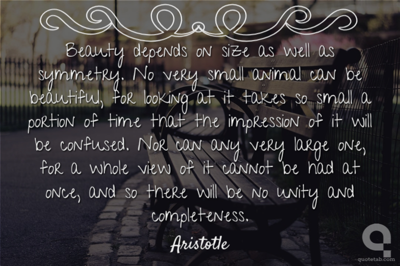 Beauty depends on size as well as symmetry. No very small animal can be beautiful, for looking at it takes so small a portion of time that the impression of it will be confused. Nor can any very large one, for a whole view of it cannot be had at once, and so there will be no unity and completeness.