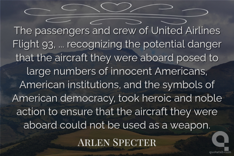 The passengers and crew of United Airlines Flight 93, ... recognizing the potential danger that the aircraft they were aboard posed to large numbers of innocent Americans, American institutions, and the symbols of American democracy, took heroic and noble action to ensure that the aircraft they were aboard could not be used as a weapon.