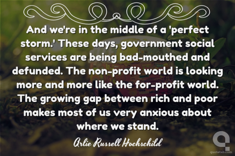 And we're in the middle of a 'perfect storm.' These days, government social services are being bad-mouthed and defunded. The non-profit world is looking more and more like the for-profit world. The growing gap between rich and poor makes most of us very anxious about where we stand.