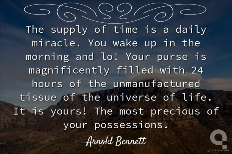 The supply of time is a daily miracle. You wake up in the morning and lo! Your purse is magnificently filled with 24 hours of the unmanufactured tissue of the universe of life. It is yours! The most precious of your possessions.