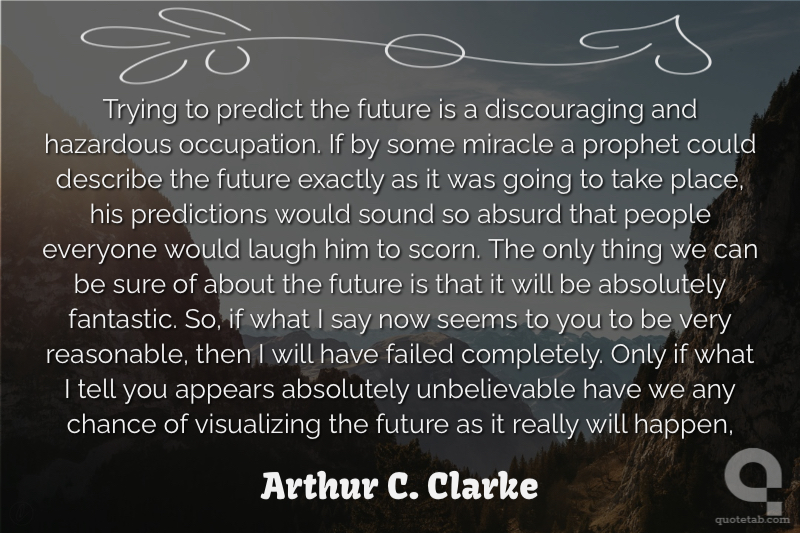 Trying to predict the future is a discouraging and hazardous occupation. If by some miracle a prophet could describe the future exactly as it was going to take place, his predictions would sound so absurd that people everyone would laugh him to scorn. The only thing we can be sure of about the future is that it will be absolutely fantastic. So, if what I say now seems to you to be very reasonable, then I will have failed completely. Only if what I tell you appears absolutely unbelievable have we any chance of visualizing the future as it really will happen,