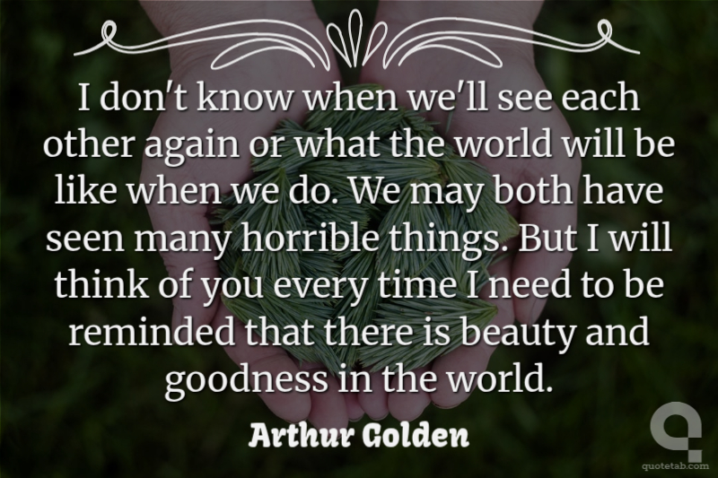 I don't know when we'll see each other again or what the world will be like when we do. We may both have seen many horrible things. But I will think of you every time I need to be reminded that there is beauty and goodness in the world.