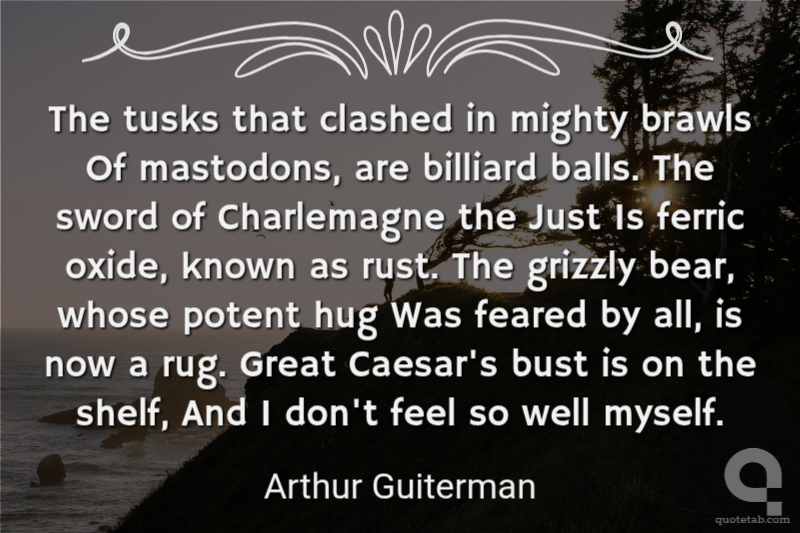 The tusks that clashed in mighty brawls Of mastodons, are billiard balls. The sword of Charlemagne the Just Is ferric oxide, known as rust. The grizzly bear, whose potent hug Was feared by all, is now a rug. Great Caesar's bust is on the shelf, And I don't feel so well myself.