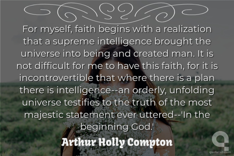For myself, faith begins with a realization that a supreme intelligence brought the universe into being and created man. It is not difficult for me to have this faith, for it is incontrovertible that where there is a plan there is intelligence--an orderly, unfolding universe testifies to the truth of the most majestic statement ever uttered--'In the beginning God.'