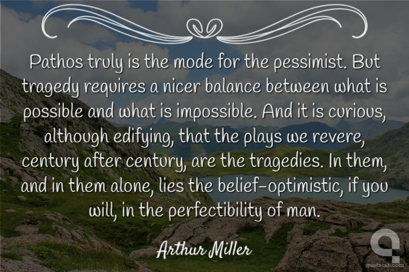 Pathos truly is the mode for the pessimist. But tragedy requires a nicer balance between what is possible and what is impossible. And it is curious, although edifying, that the plays we revere, century after century, are the tragedies. In them, and in them alone, lies the belief-optimistic, if you will, in the perfectibility of man.