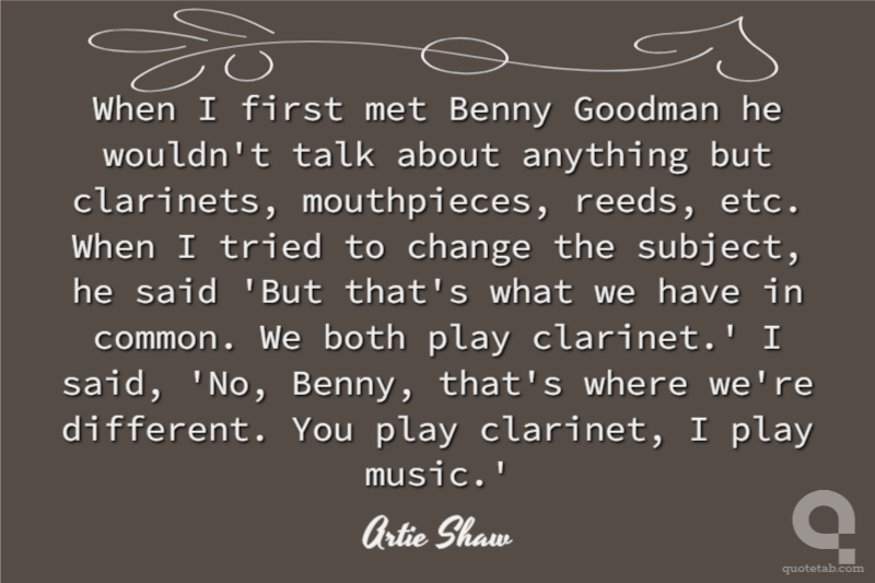 When I first met Benny Goodman he wouldn't talk about anything but clarinets, mouthpieces, reeds, etc. When I tried to change the subject, he said 'But that's what we have in common. We both play clarinet.' I said, 'No, Benny, that's where we're different. You play clarinet, I play music.'