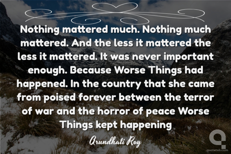 Nothing mattered much. Nothing much mattered. And the less it mattered the less it mattered. It was never important enough. Because Worse Things had happened. In the country that she came from poised forever between the terror of war and the horror of peace Worse Things kept happening