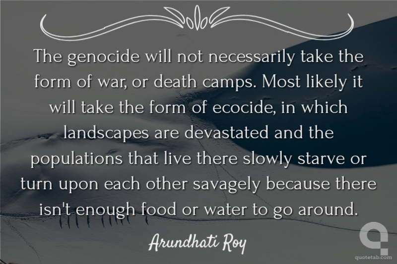 The genocide will not necessarily take the form of war, or death camps. Most likely it will take the form of ecocide, in which landscapes are devastated and the populations that live there slowly starve or turn upon each other savagely because there isn't enough food or water to go around.