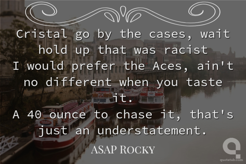 Cristal go by the cases, wait hold up that was racist I would prefer the Aces, ain't no different when you taste it. A 40 ounce to chase it, that's just an understatement.