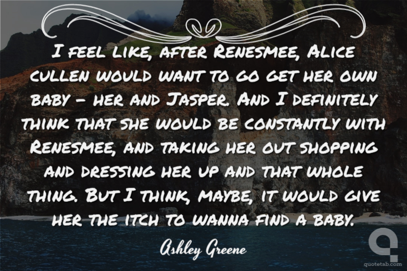 I feel like, after Renesmee, Alice cullen would want to go get her own baby - her and Jasper. And I definitely think that she would be constantly with Renesmee, and taking her out shopping and dressing her up and that whole thing. But I think, maybe, it would give her the itch to wanna find a baby.