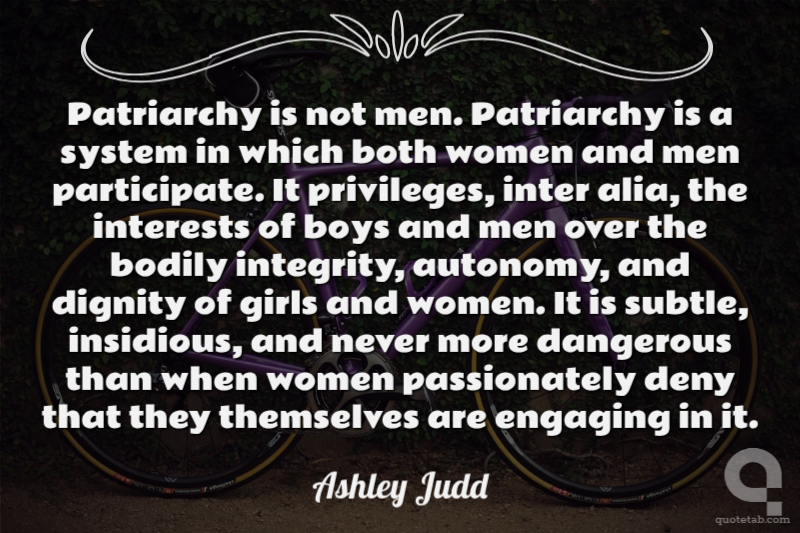 Patriarchy is not men. Patriarchy is a system in which both women and men participate. It privileges, inter alia, the interests of boys and men over the bodily integrity, autonomy, and dignity of girls and women. It is subtle, insidious, and never more dangerous than when women passionately deny that they themselves are engaging in it.