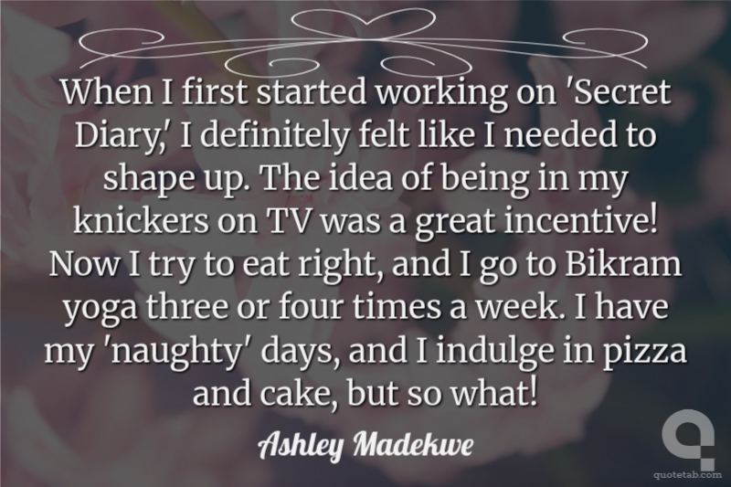 When I first started working on 'Secret Diary,' I definitely felt like I needed to shape up. The idea of being in my knickers on TV was a great incentive! Now I try to eat right, and I go to Bikram yoga three or four times a week. I have my 'naughty' days, and I indulge in pizza and cake, but so what!