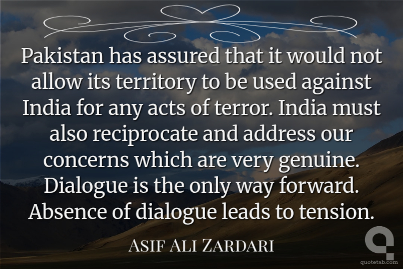 Pakistan has assured that it would not allow its territory to be used against India for any acts of terror. India must also reciprocate and address our concerns which are very genuine. Dialogue is the only way forward. Absence of dialogue leads to tension.