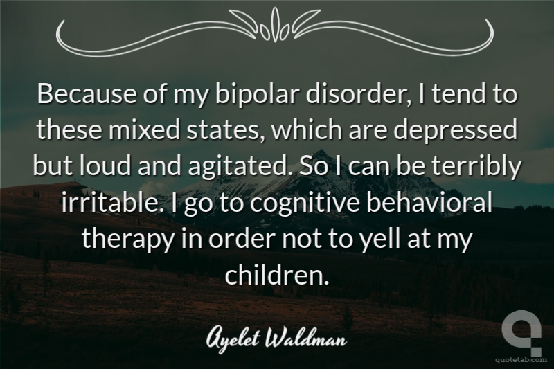 Because of my bipolar disorder, I tend to these mixed states, which are depressed but loud and agitated. So I can be terribly irritable. I go to cognitive behavioral therapy in order not to yell at my children.