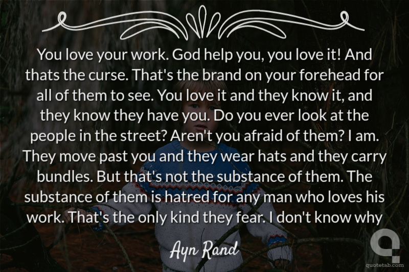 You love your work. God help you, you love it! And thats the curse. That's the brand on your forehead for all of them to see. You love it and they know it, and they know they have you. Do you ever look at the people in the street? Aren't you afraid of them? I am. They move past you and they wear hats and they carry bundles. But that's not the substance of them. The substance of them is hatred for any man who loves his work. That's the only kind they fear. I don't know why